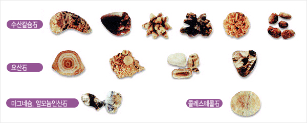 전체 요로결석의 약1/3만이 단일성분의 순수결석이며 대부분은 두가지 성분 이상으로 구성된 혼합결석입니다. 순수결석은 수산칼슘, 인산칼슘, 탄산인산칼슘, 요산, 인산-마그네시움-암모니움, 시스틴, 실리콘, 산틴 등으로 구성된 단일성분의 결석이며, 혼합결석은 위와 같은 결석성분들 중에서 두가지 이상이 함께 구성된 결석입니다. 전체 요로결석의 약 80%는 수산칼슘이며 가장 많은 결석형태는 수산칼슘과 인산칼슘이 합쳐진 혼합결석입니다.