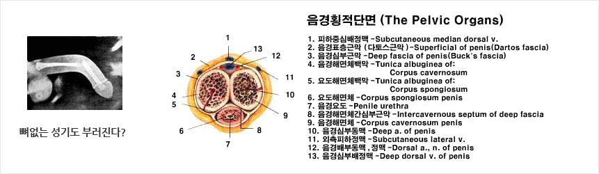 음경은 3개의 원주형발기조직으로 되어있는데, 배측(윗쪽)의 좌우에 있는 음경해면체와 복측(아래쪽)에 있는 1개의 요도해면체가 그것인데 음경해면체는 백막으로 둘러싸여 있습니다.